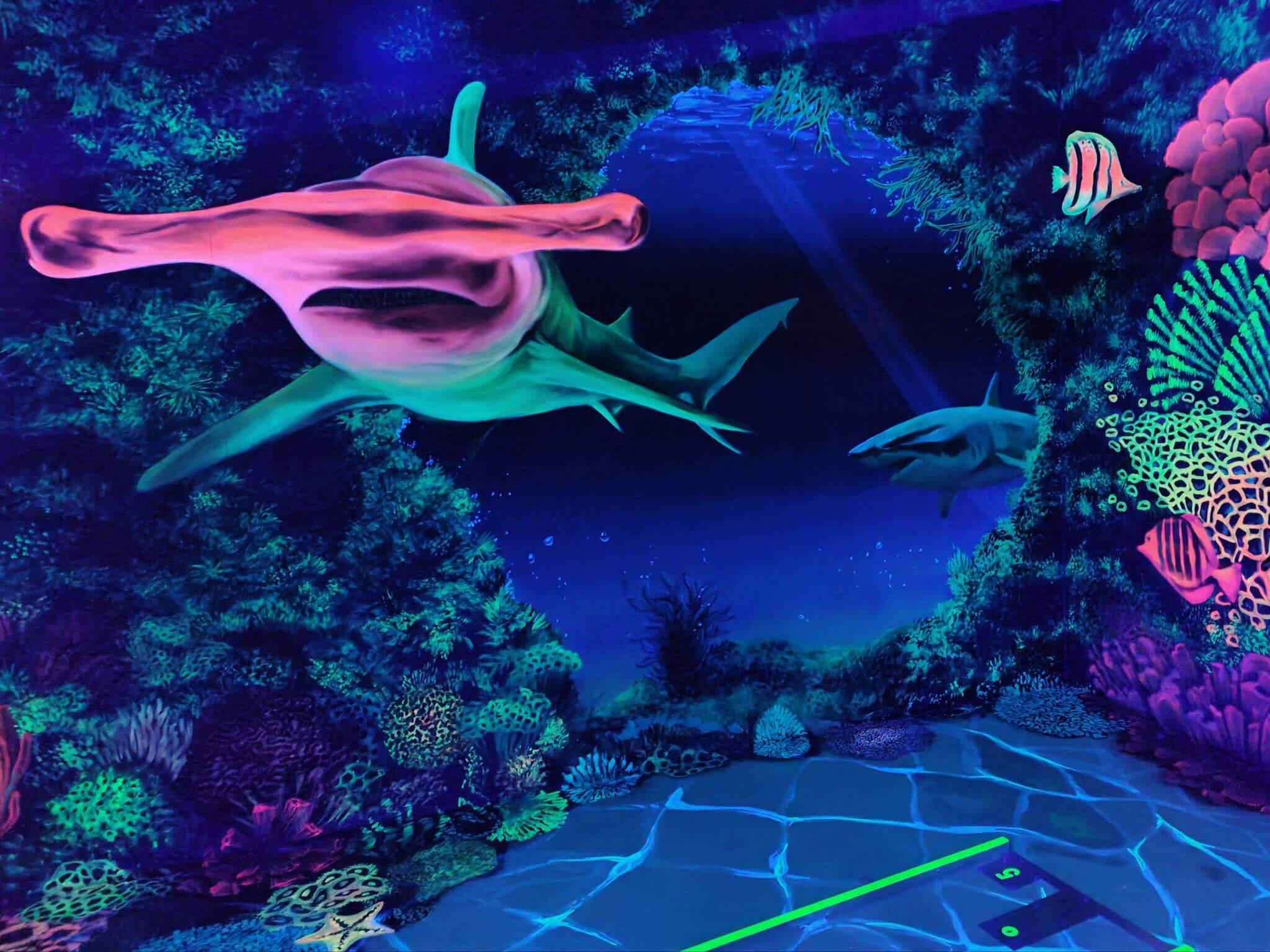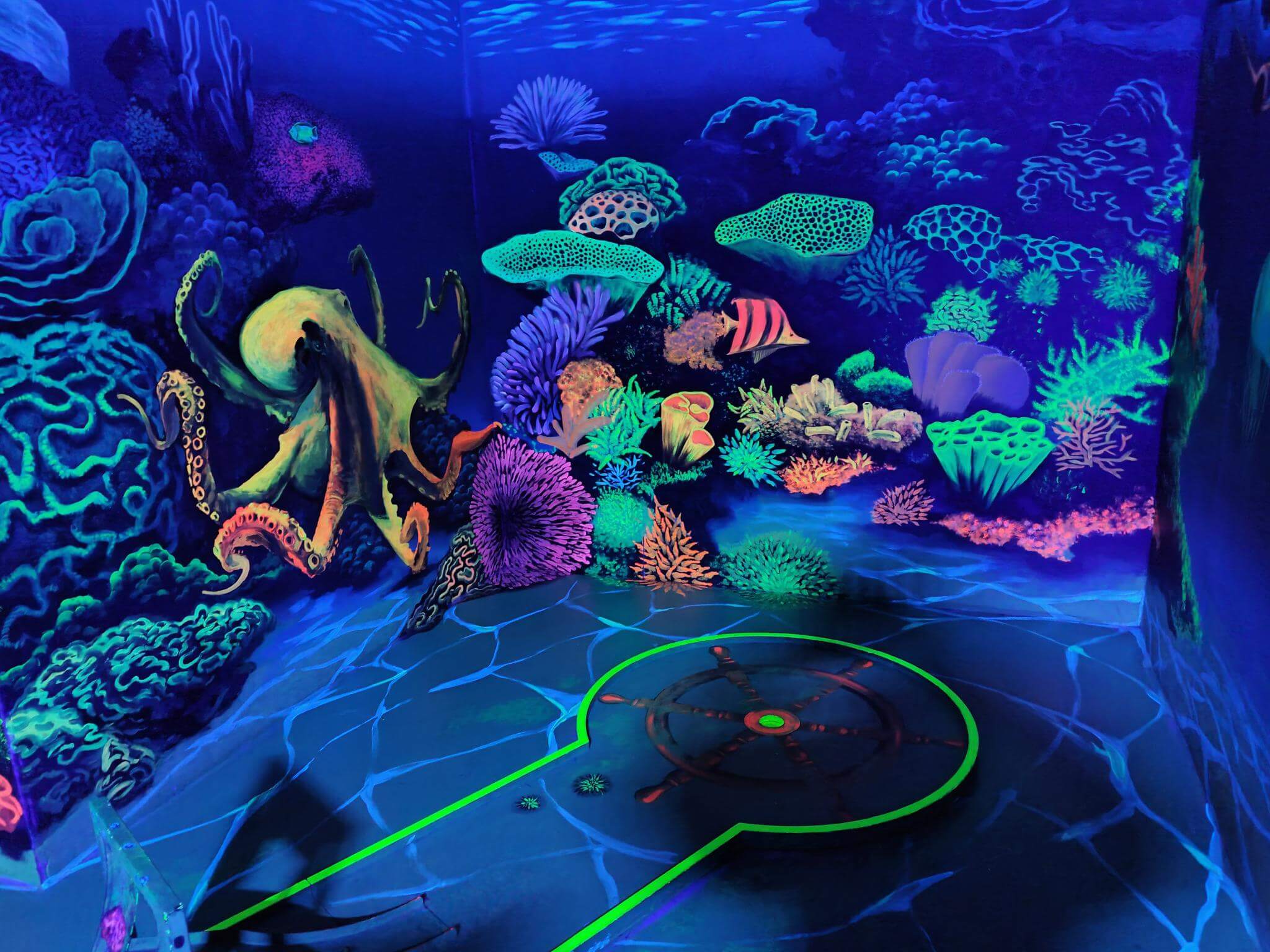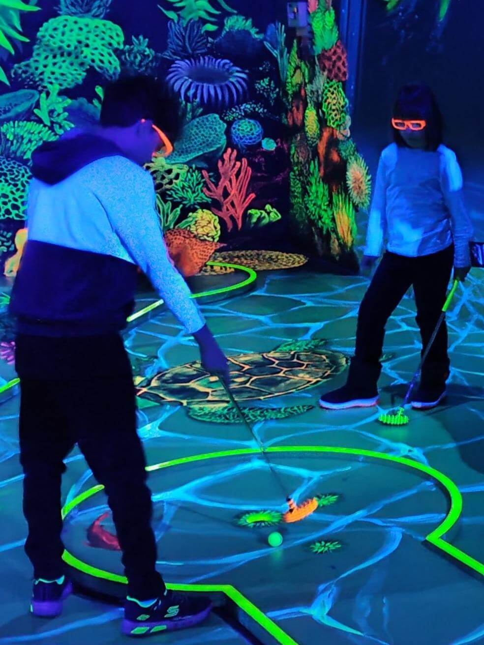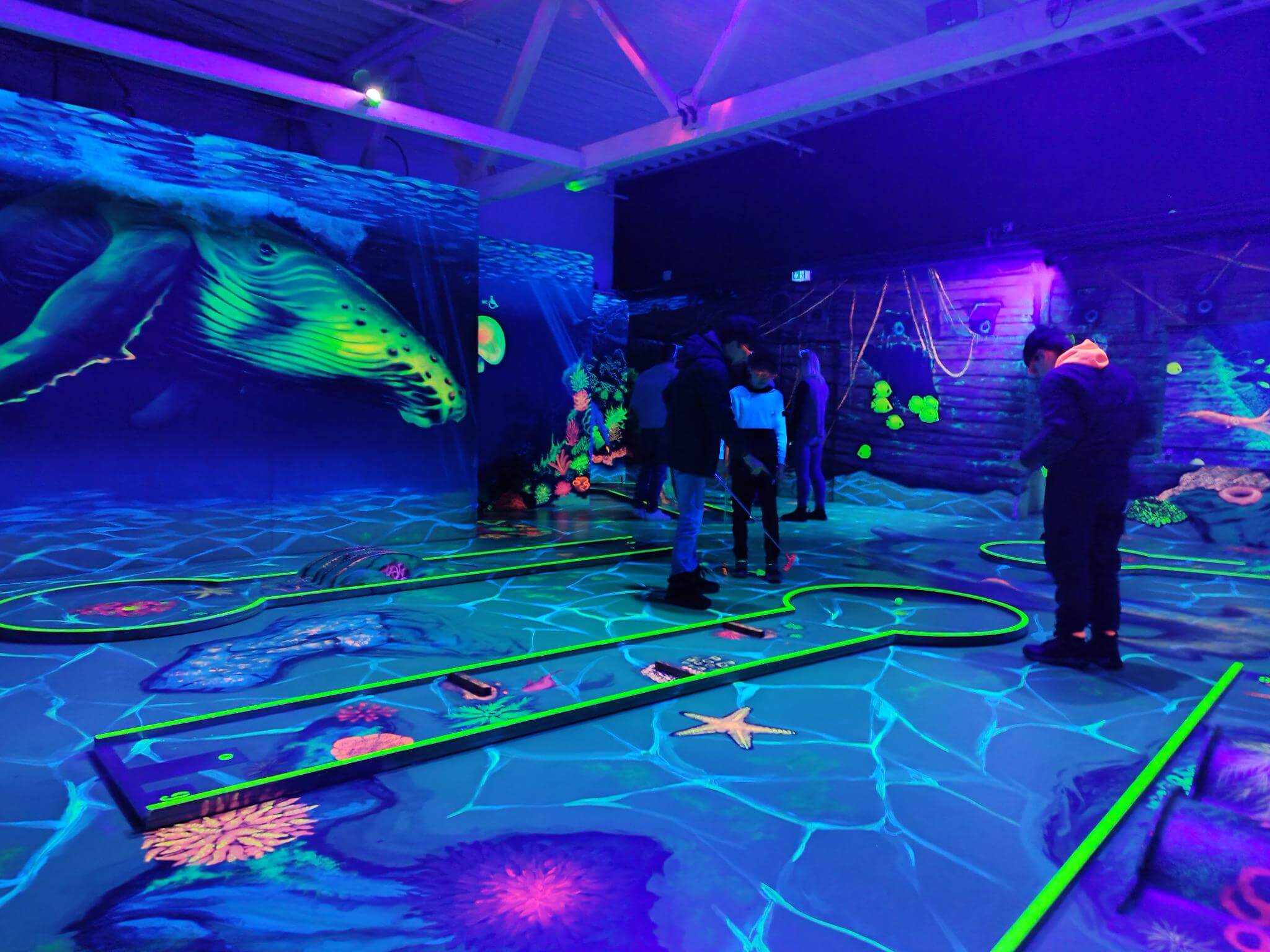 Sonntag. Dunkel. Mieses Wetter. Warum nicht mal Golfen. In einem farbenprächtigen Ambiente zeigten die Angetretenen, dass es, so vorhanden, beim Minigolf auf Ruhe und Geduld ankommt. Auch wenn Erfolg und Frust bei dieser Sportart häufig sehr eng beieinander liegen, gaben alle ihr Bestes. Umrahmt wurde das Event von bunten 3D Räumen, wie z.B. Unterwasserlandschaften oder der Weiten des Weltalls.